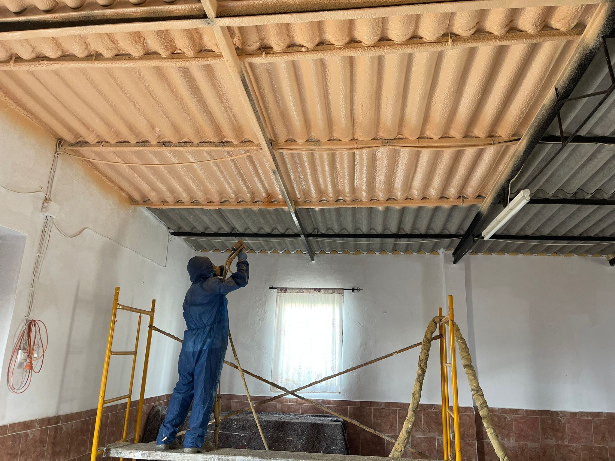 Intervención en cubierta con espuma de poliuretano proyectado para mejorar aislamiento térmico y reducir puntos de fuga energética.
